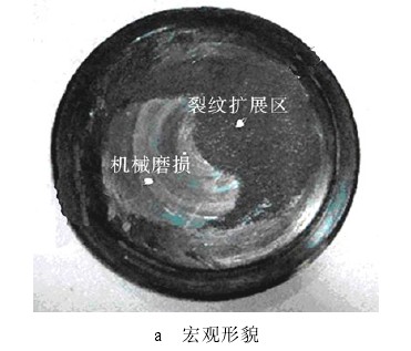 2.1.1 軸斷裂面宏觀及微觀形貌觀察 軸斷裂面處于軸上軸承安裝處的過渡圓弧區(qū)域(軸承安裝根部)。圖 1 為斷軸宏觀斷裂面,局部發(fā)生磨損,斷口表面齊整與軸向垂直,無縮頸和塑性變形痕徑。斷口疲勞條帶明顯,從外圓向中心擴展,最終瞬斷區(qū)面積小于軸截面積的 10%,說明斷軸所受名義應(yīng)力較小。