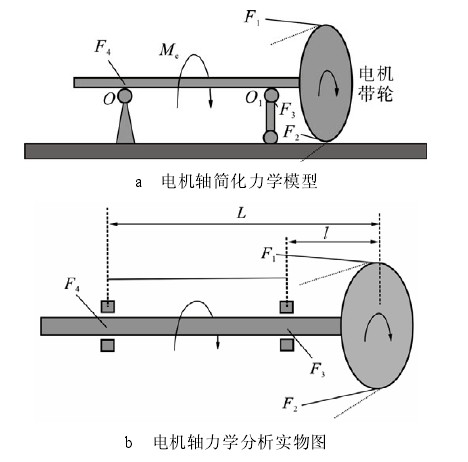2.2 電機軸力學(xué)計算分析由于電機軸為階梯軸,不同階梯截面處承受的力矩和應(yīng)力是不同的。電機運行時軸受到彎扭力矩的共同作用,如果某一階梯截面承受應(yīng)力過大,則可能最先在階梯截面過渡圓弧處萌發(fā)裂紋和發(fā)生斷裂,因此找出電機軸受力危險截面,對判斷軸斷裂原因有重要作用。電機軸力學(xué)分析簡化模型如圖 4 所示。圖中,F(xiàn)1、F2為皮帶張緊力;F3、F4為電機軸支撐力;Me為電機轉(zhuǎn)矩;O 與O1為電機軸支撐點;F 為皮帶張緊力 F1與 F2的合力;T 為 O1支撐點承受的彎矩;D 為電機軸分析截面直徑;M 為分析截面對應(yīng)扭矩;L 和 l 分別為電機左端軸承距右端軸承及電機帶輪的水平距離。