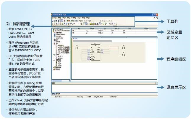 整合運動控制編輯:ISPSoft V3將邏輯編程與運動編程整合在同一套軟件上,并提供符合國際標準規(guī)格 PLCopen? 的功能塊以及臺達提供的豐富功能塊