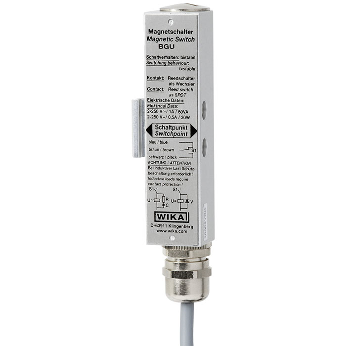 BGU型式磁性開關用于磁翻柱式液位計的液位高度限位檢測。開關動作時產生一個二進制信號,供給下游電路使用或控制設備。雙穩(wěn)態(tài)磁性開關可保持住信號。